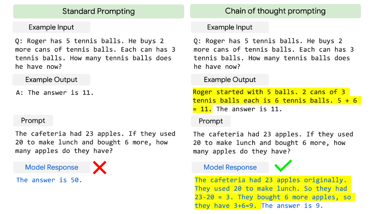 ↑ 标准提示与思维链提示的示例小学数学问题。 思维链提示将多步推理问题的提示分解为中间步骤(以黄色突出显示),类似于人处理它的方式。